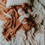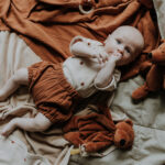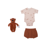 So cute and beautiful baby gift set in caramel brown color! Will suit for both – baby girl and boy. Set includes – short-sleeved bodysuit, soft muslin fabric bloomers and comforter with dummy holder – teddy. Short sleeved wrap bodysuit, made from wonderfully soft organic cotton. Press-stud fastening at front for easy dress-up. The double press-stud at the bottom allows to change the size of body. For additional comfort this body features special place at the bottom for diaper. Material: 100% organic cotton; GOTS certified Press-stud: nickel free Machine wash in 40°C The color of the product may differ slightly from the one shown in the picture. Bloomers made from muslin fabric, wide elastic waist and elasticated legs for additional comfort. Material composition: 100% cotton – muslin fabric; GOTS certified The color of the product may differ slightly from the one shown in the picture. Soft and fluffy comforter is an excellent sleeping friend for your little one. It is possible to put a dummy in his paw and the comforter will become dummy holder as well. Material: 100% organic cotton Filling: Oeko-Tex 100 certified Corn fiber Height 25 cm Care: Machine wash in 40°C Suitable from birth The color of the product may differ slightly from the one shown in the picture.