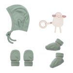 Functional and comfortable set for your baby – 100% merino wool hat, booties, gloves and what is more – 100% organic crinkle sheep with wooden teether . Hat fits snugly around the head and is secured in place with ties. Merino wool booties are comfortable and stylish; stretchy turned down cuffs will keep booties in place. For complete comfort – warm merino wool baby gloves. Even more – a crinkle sheep with wooden teether is added to this set. Safe and natural teether with chewable parts that provides comfort and relief during teething. Crinkle sheep make fun sounds as baby touches. It is a perfect stimulant for sensory learning and a perfect size for small hands to hold. Dimensions: 38/40 size hat + 8 size booties (0 – 2 months); 40/42 size hat + 10 size booties (2 – 4 months) / gloves – one size / crinkle – height 16 cm Material: 100% merino wool for accessories; 100% cotton (organic, certified) for crinkle sheep Other crinkle materials: rustling foil; wooden ring: maple wood treated with natural beeswax, diameter 6 cm, fastens with press-stud Accessories care: machine wash 30’C; crinkle: machine wash in 40°C Made in Liepaja, Latvia (EU) The color of the product may differ slightly from the one shown in the picture.